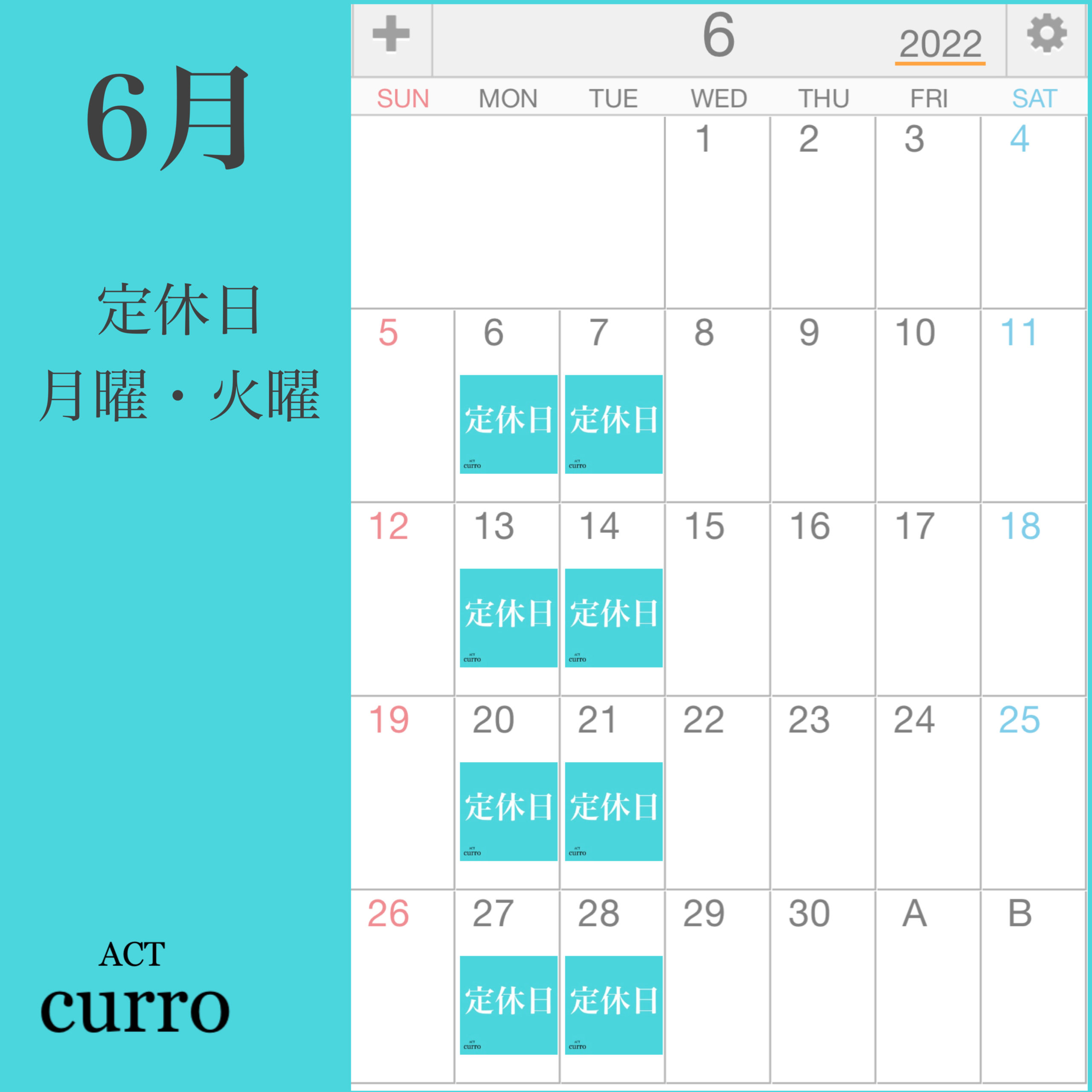 定休日は、月曜・火曜です。